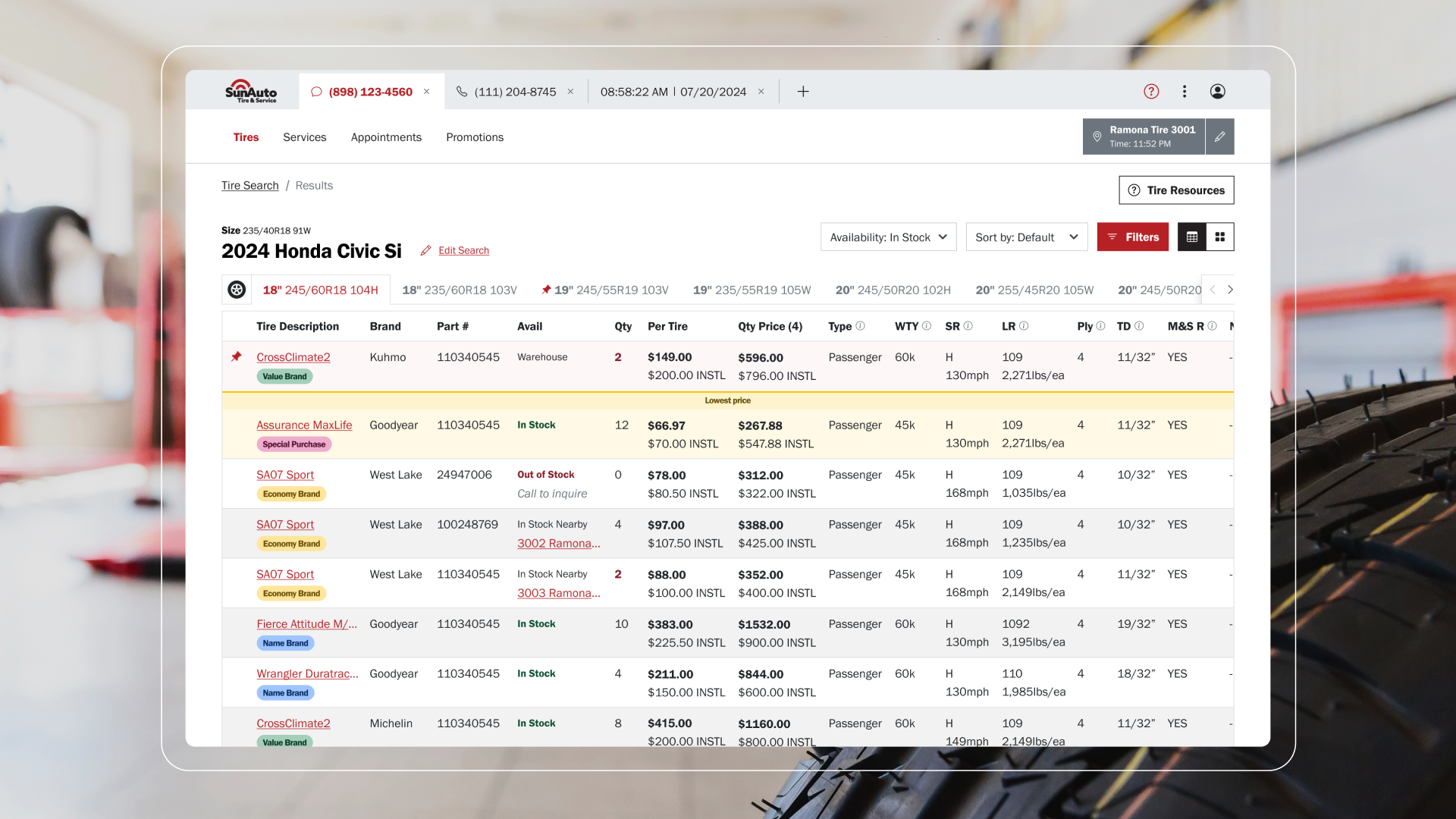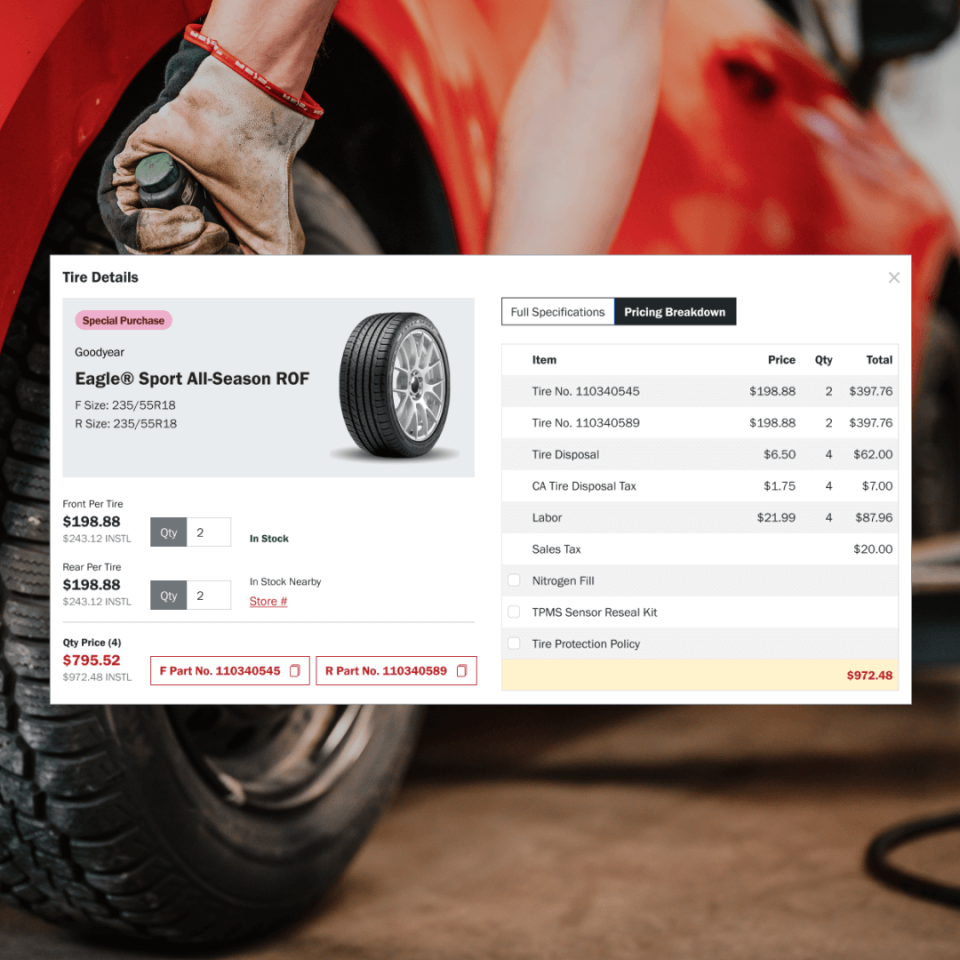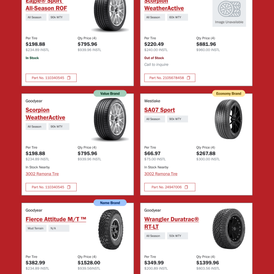 Sun Auto comprises over 19 individual brands that independently service and sell tires and parts to customers. When customers call a store location with questions or to book an appointment, a representative assists them. However, due to differences between brands, communicating pricing, inventory, and accessing up-to-date information was complicated, and the outdated system made training difficult for reps. Our goal was to create an app that simplifies everyday actions for reps and reduces the number of applications needed to perform their tasks.